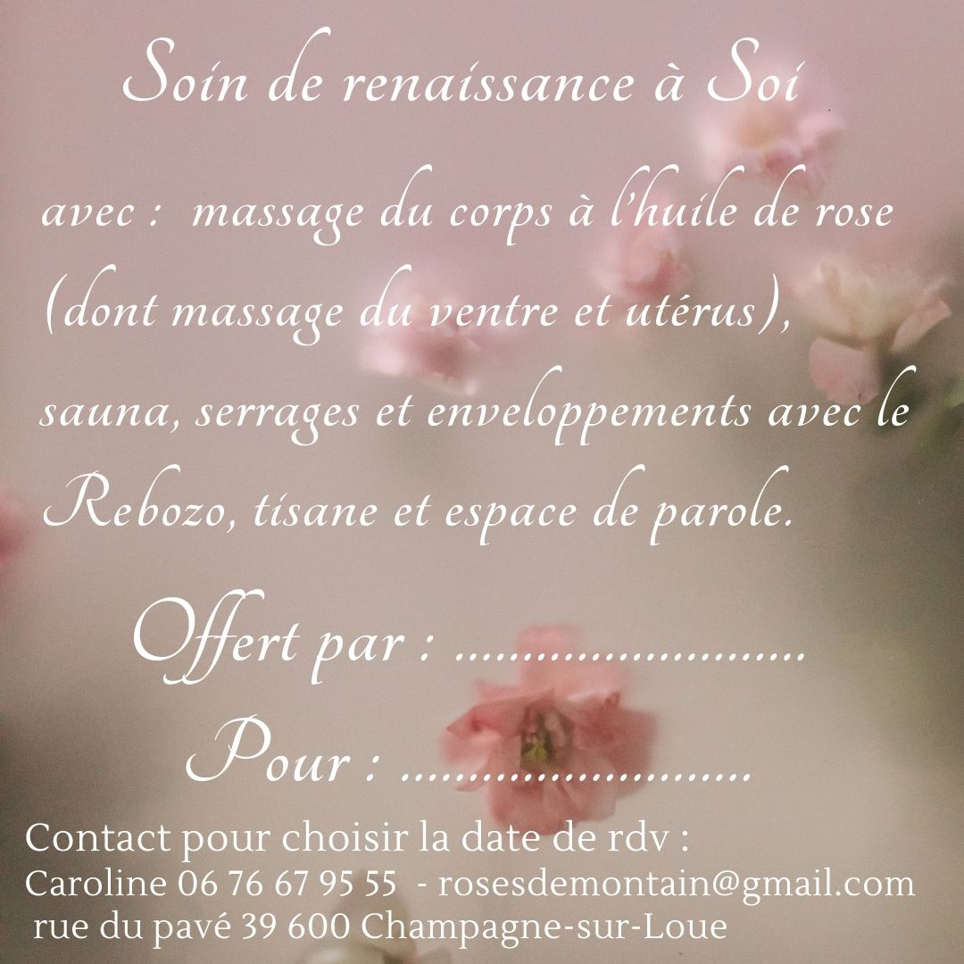 - Soin rituel Rebozo de 3h avec une de mes amies pour être vraiment cocoonée avec massage à 4 mains – Soin de renaissance à Soi ou Soin post-partum (massage, sauna, serrages et enveloppements avec le Rebozo, tisane et espace de parole) – 260 euros